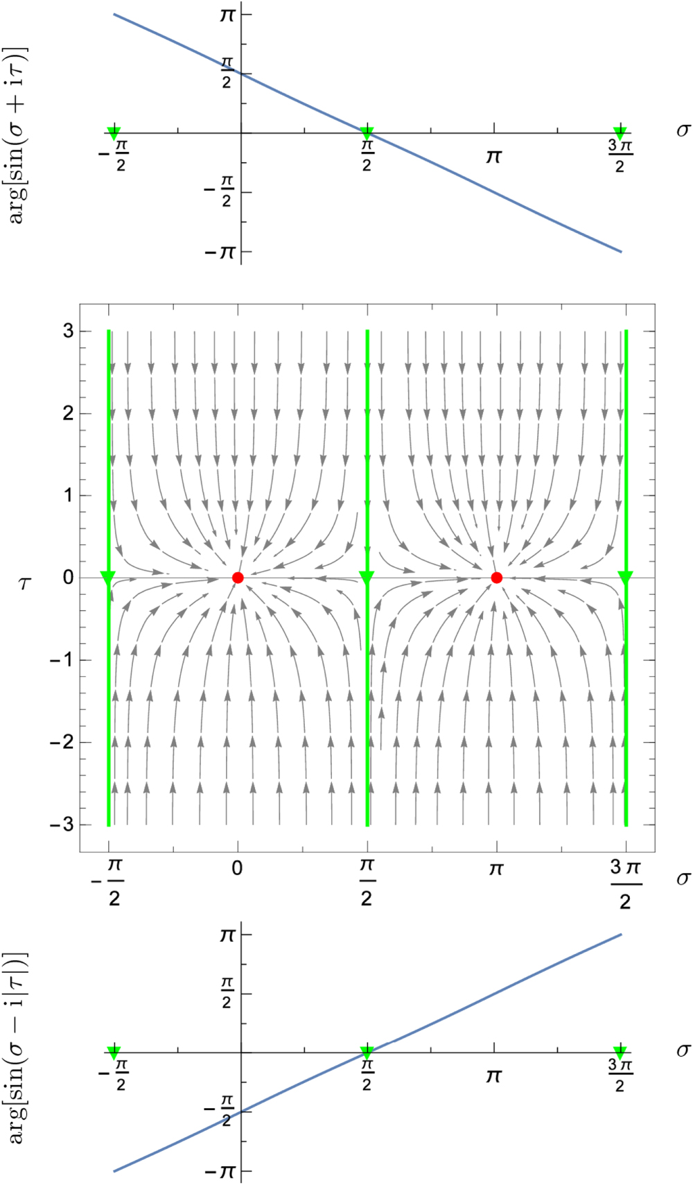 Figure A1. Proof that all zeros of the sine function S lie on the real axis solely based on the asymptotic properties of (i) the corresponding Newton flow represented in the complex plane (center), and (ii) the phases of the individual flow lines (top and bottom).