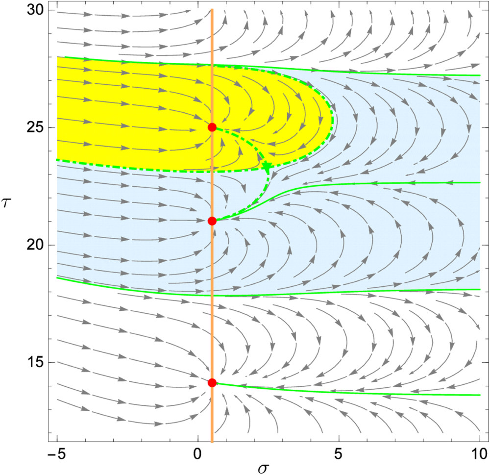 Figure 1. Newton flow of the Riemann zeta function in the complex plane given by the argument s ≡ σ+iτ in the neighborhood of the critical line σ =1/2, indicated by the orange line.