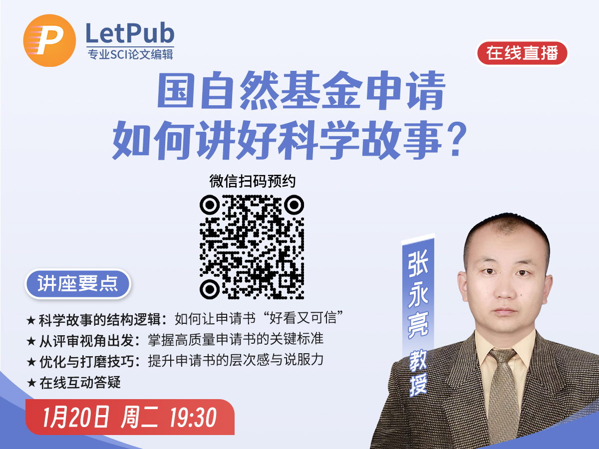 在基金申请的激烈竞争中,评审专家最期待看到的,可能不是“堆砌成果”的陈述,而是一篇逻辑清晰、科学动人的故事。1月20日(周二)19:30,LetPub 特邀张永亮教授带来一场面向科研人员的实战型基金申报指导讲座。