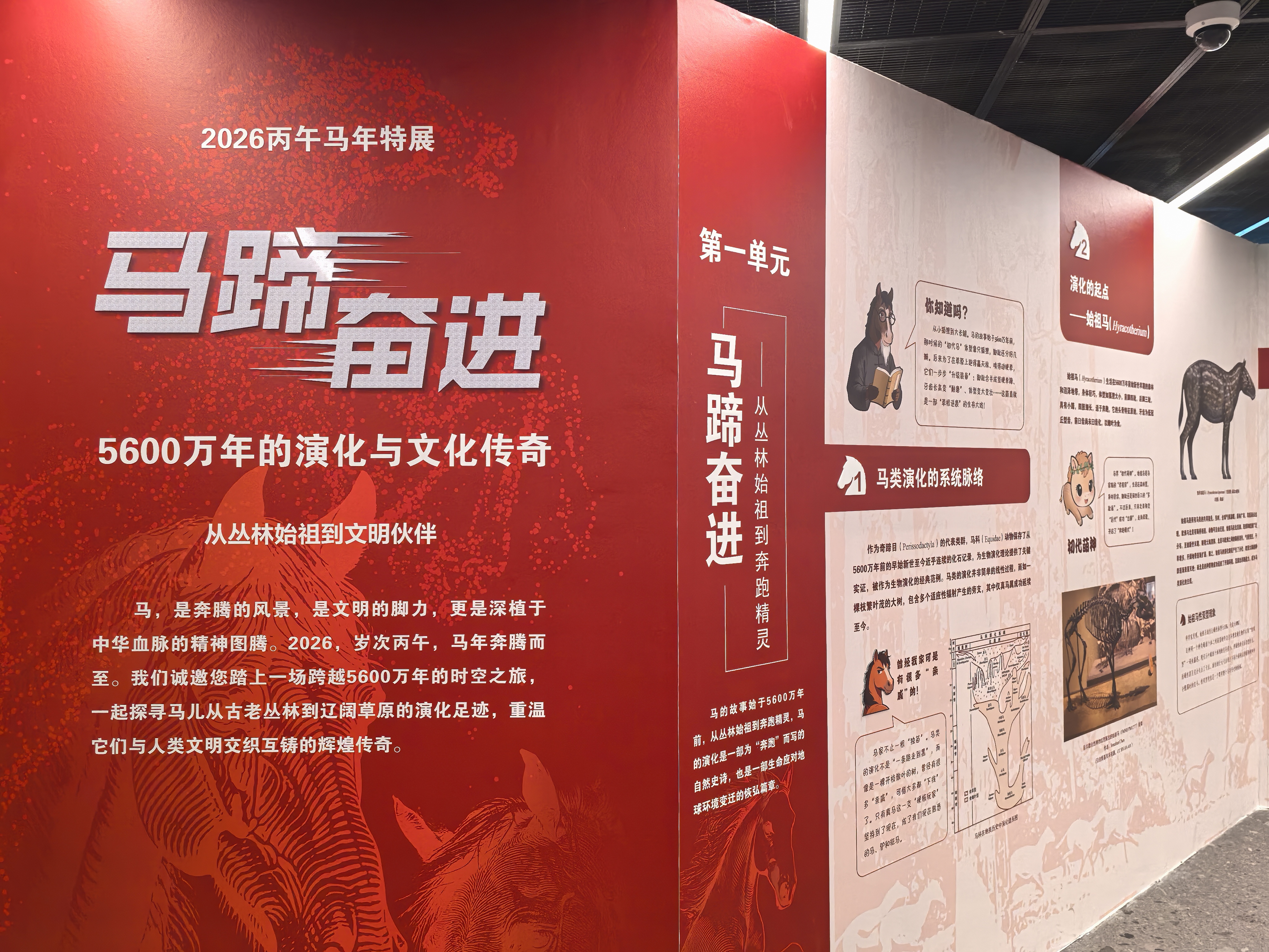 2026年丙午马年新春,京畿福地保定的年味尚未散去,中国古动物馆(保定)一号展厅的三角区域内,一场跨越5600万年的时空之约已然启幕。“马蹄奋进——5600万年的演化与文化传奇”特展,以马为引,串联起生命演化的洪荒史诗与人类文明的千年脉络。踏入展厅的那一刻,仿佛听见远古林地的轻蹄声与草原上的嘶鸣交相回响,笔墨丹青中的骏影与历史烟尘中的铁骑并肩驰骋,在光影与展品的交织中,我们得以触摸这一物种从丛林萌兽到文明图腾的蜕变,读懂人马共生的温暖与生命演化的坚韧。