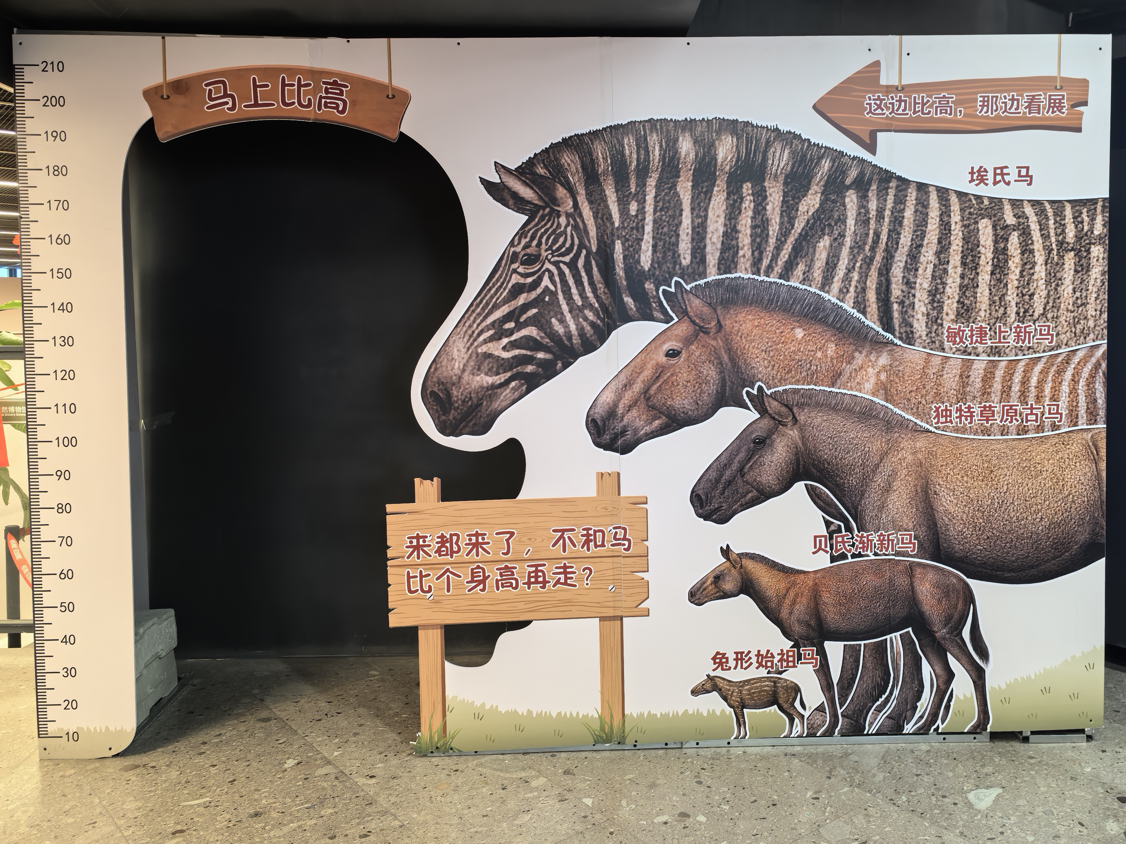 此次特展展期从2026年2月19日延续至4月30日,藏身于地球装置南侧的三角区域。展馆的设计巧思从入口便已铺展,棕色的主色调如草原沃土,墙面镌刻的马科演化时间轴如展开的长卷,指引着参观者循着马的足迹,从5600万年前的始新世一路走到当下。入口处与马比身高的项目,从最矮的始祖马到最高的埃氏马,必有一匹可与从婴儿到成人的每个参观者匹配。展厅内没有喧宾夺主的声光特效,仅以简约的展柜、清晰的图文和珍贵的标本,让马的故事成为绝对的主角,在静谧的氛围中,每一位参观者都能沉下心来,与千万年的时光对话。