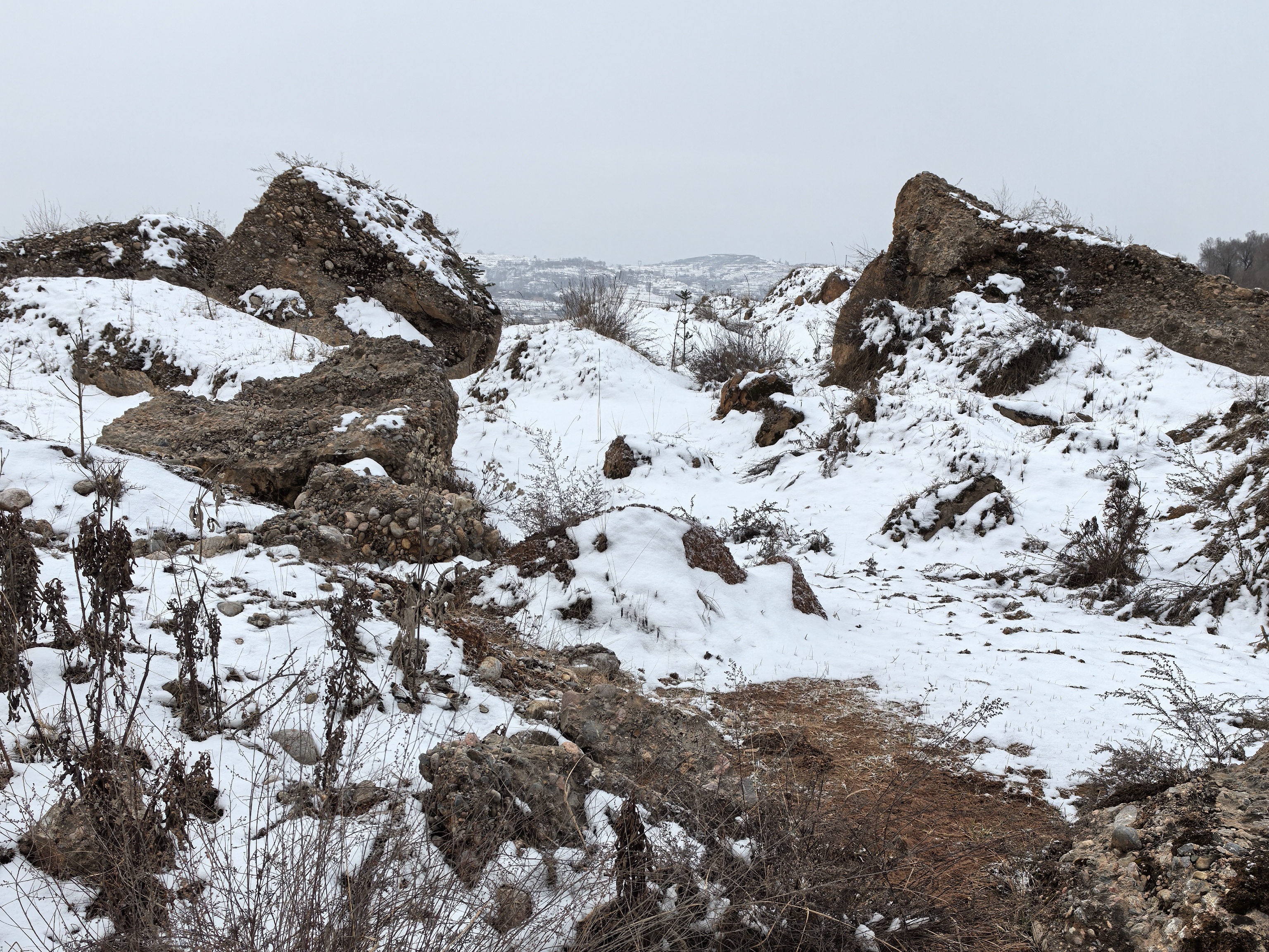 当我们来到埃氏马化石的出土地点,东乡县那勒寺乡龙担时,一片白雪皑皑的原野仿佛是早更新世环境的在现。这个季节渺无人迹,雪地上只有穿插交错的野鸡和狐狸脚印,完美复刻了真马动物群的一个局部特写。严寒没有让我们退却,一直攀登了剖面高处真马动物群的产出层位。