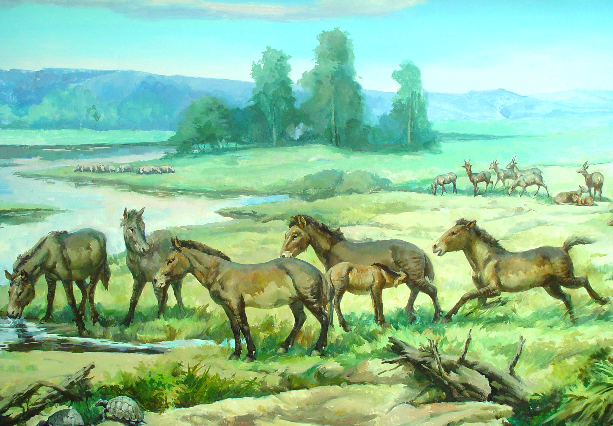 距今250-200万年,早更新世的临夏盆地,青藏高原大幅隆升,气候寒冷干燥,黄土广泛沉积,草原与荒漠交替,生存竞争空前激烈。巨颏虎、锯齿虎、中华虎、西瓦猎豹、硕鬣狗等顶级掠食者横行,大型食草动物面临严苛的生存考验。就在这样的环境中,马类演化迎来终极巅峰——埃氏马横空出世,成为世界上体型最大、脸部最长的真马,书写下马族演化的华彩乐章。