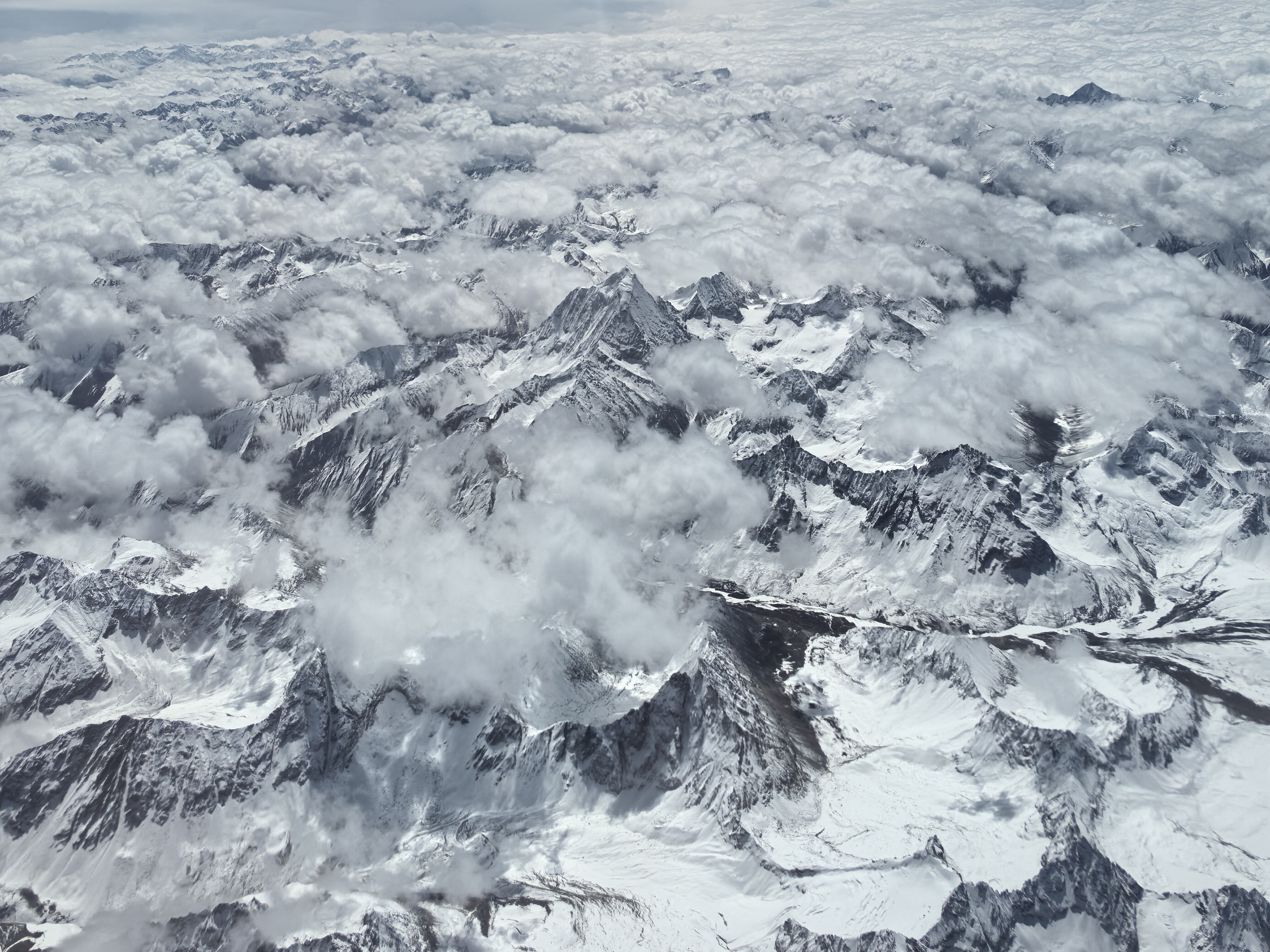 再往前行,海拔陡然升高,天地间的颜色骤然一变。皑皑白雪,在不知不觉间,已经铺满了山顶。起初只是山尖一点点白,像谁不小心撒落的一把盐。可不过片刻,白茫茫的雪色便占据了整个视野。一座座雪峰拔地而起,尖顶直指苍穹,在万米高空之下,依然显得巍峨逼人。阳光毫无遮挡地洒在雪山上,亮得有些晃眼,却又纯净得让人不忍心移开目光。白雪不是单调的白,而是带着微微的蓝调,带着冰的清冽,山岩裸露的地方是深灰,积雪最厚的地方是莹白,阴影处又泛着淡淡的冰蓝,几种颜色交织在一起,层次丰富,美得让人屏息。