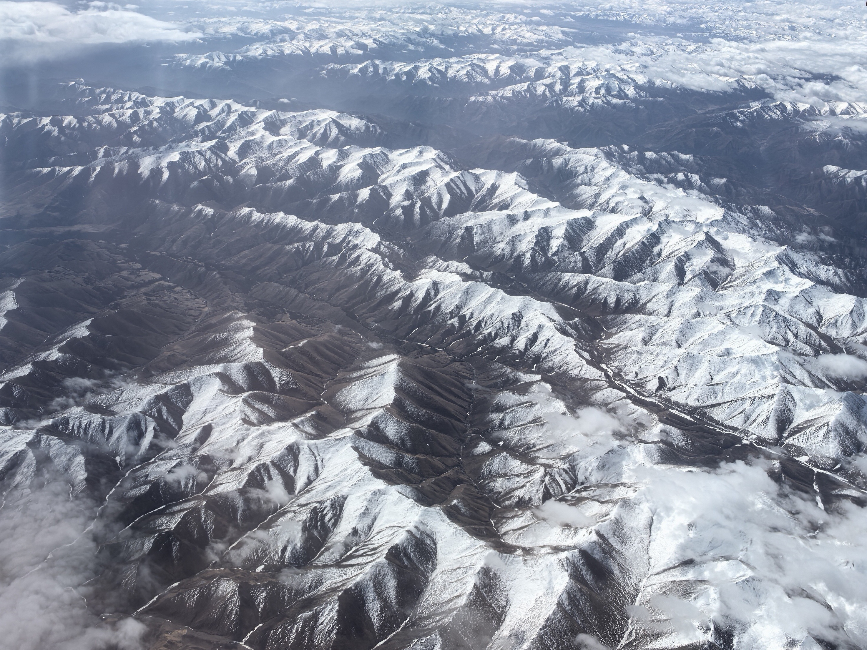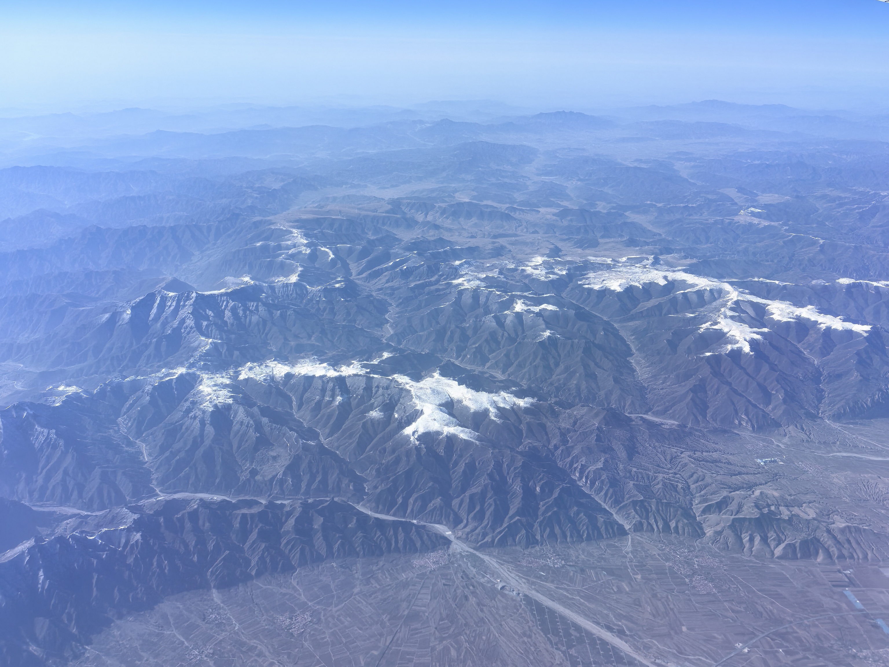 飞机攀升至万米高空,渐渐平稳飞行,窗外的景象瞬间换了人间。脚下是广袤的华北大地,平坦的田野错落有致,村庄星罗棋布,在阳光的照耀下,尽显中原大地的厚重与平和。随着飞机不断向西飞行,视线中渐渐出现连绵的山脉,那是巍峨的太行山,它如一道天然屏障,分隔开华北平原与黄土高原,山峦层叠,沟壑纵横,尽显苍茫雄浑。阳光洒在山脊之上,明暗交错,勾勒出山脉硬朗的轮廓,仿佛能感受到大地千万年的沧桑变迁。主脊上还覆盖着积雪,正在准备为山下等待耕种的土地提供灌溉的融水。