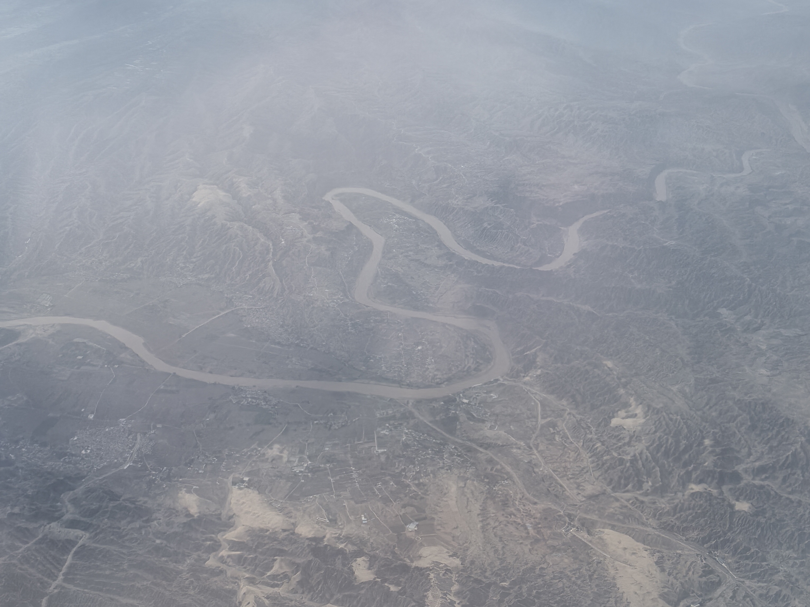越过太行山,便进入了黄土高原的上空。脚下的大地呈现出深沉的土黄色,千沟万壑的地貌格外醒目。春天沙尘中隐约可见的黄河宛如一条金色的巨龙,在高原腹地蜿蜒穿梭,滋养着这片古老的土地。从空中俯瞰,黄河水奔腾不息,裹挟着泥沙,一路向东,见证着华夏文明的源远流长。塬上连片的农田、芝麻粒似的村落、细如丝线的公路,在这片雄浑的土地上,勾勒出人与自然共生的美好画卷。