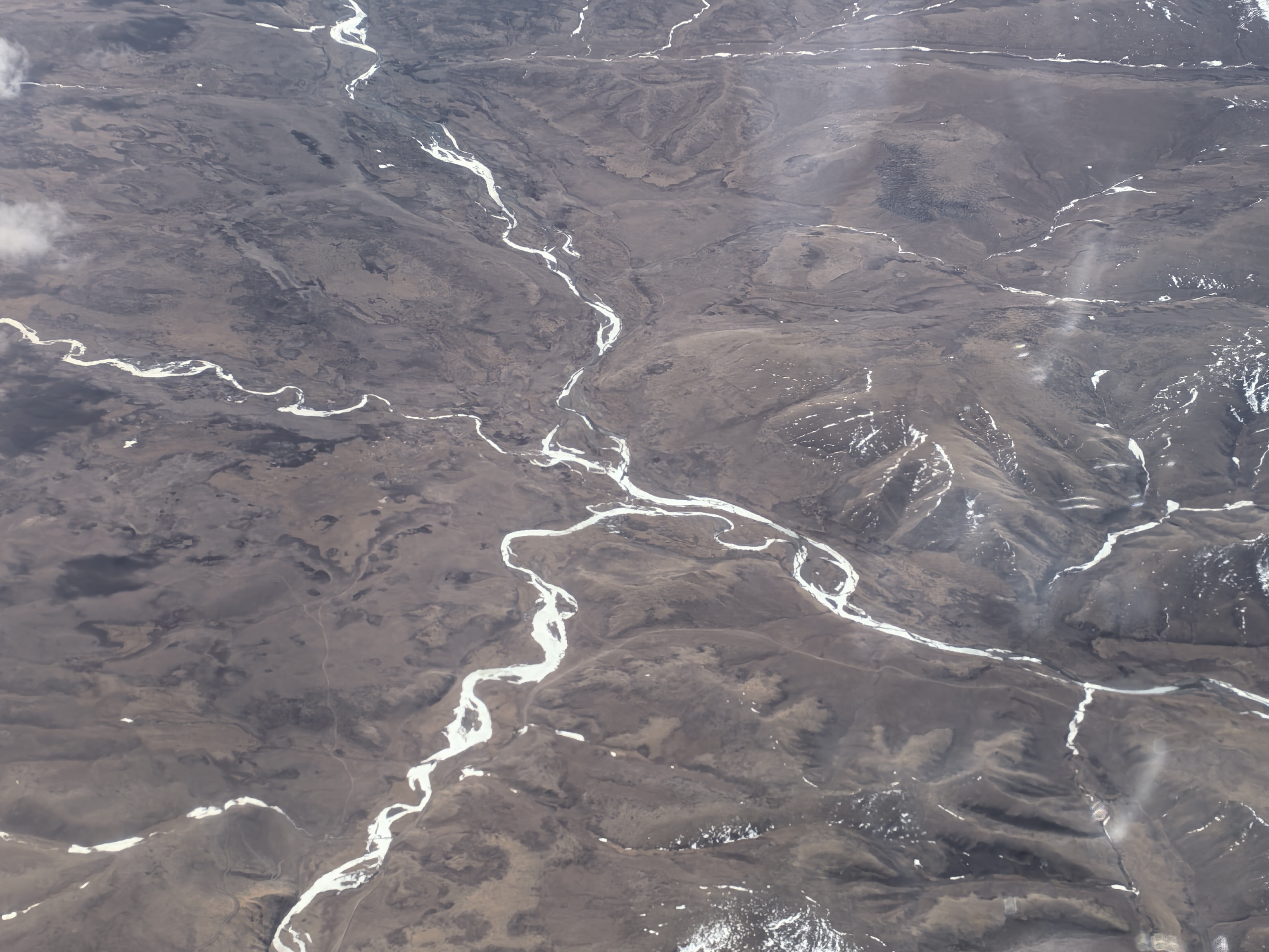 最先闯入视野的,是一层又一层连绵不断的浅山。它们不再像华北平原那样圆润平缓,也不似黄土高原那般沟壑纵横,而是线条硬朗、棱角分明,像是被大自然用巨斧劈削过一般,一层叠着一层,向着天际无限铺展。山体的颜色是淡淡的土黄与青灰,向阳的一面被阳光照得明亮,背阴的一面则沉在柔和的阴影里,明暗交错。冰冻的河流交叉而过,像是大自然的十字路口。越往高处,山体上的植被越是稀疏,只剩下裸露的岩石,沉默地诉说着千万年的风蚀与地壳运动。风在高原上是不留情面的,千万年的吹拂,把山峦雕刻出一道道深刻的纹路,从空中望去,如同大地舒展的筋骨,苍劲有力。