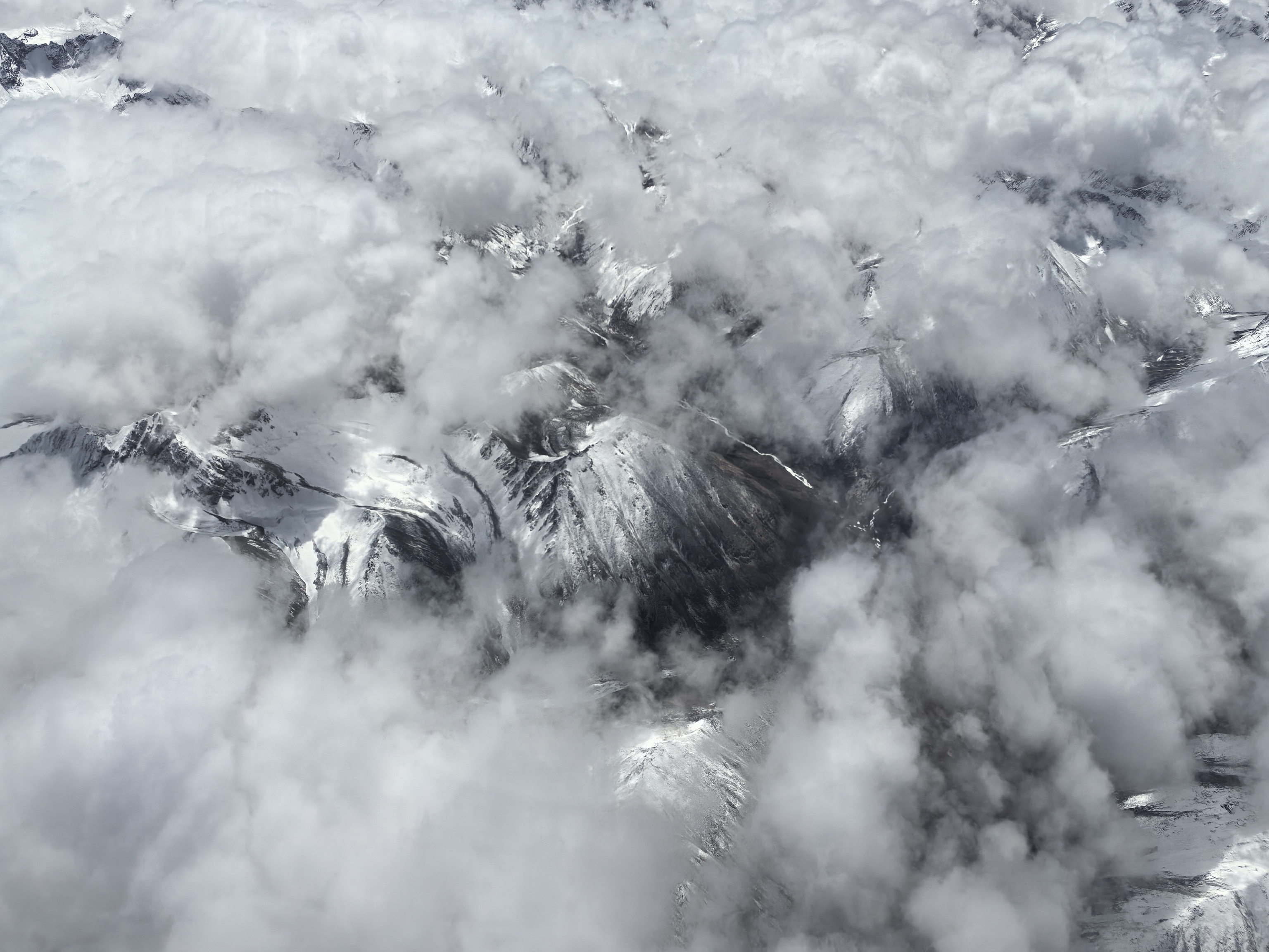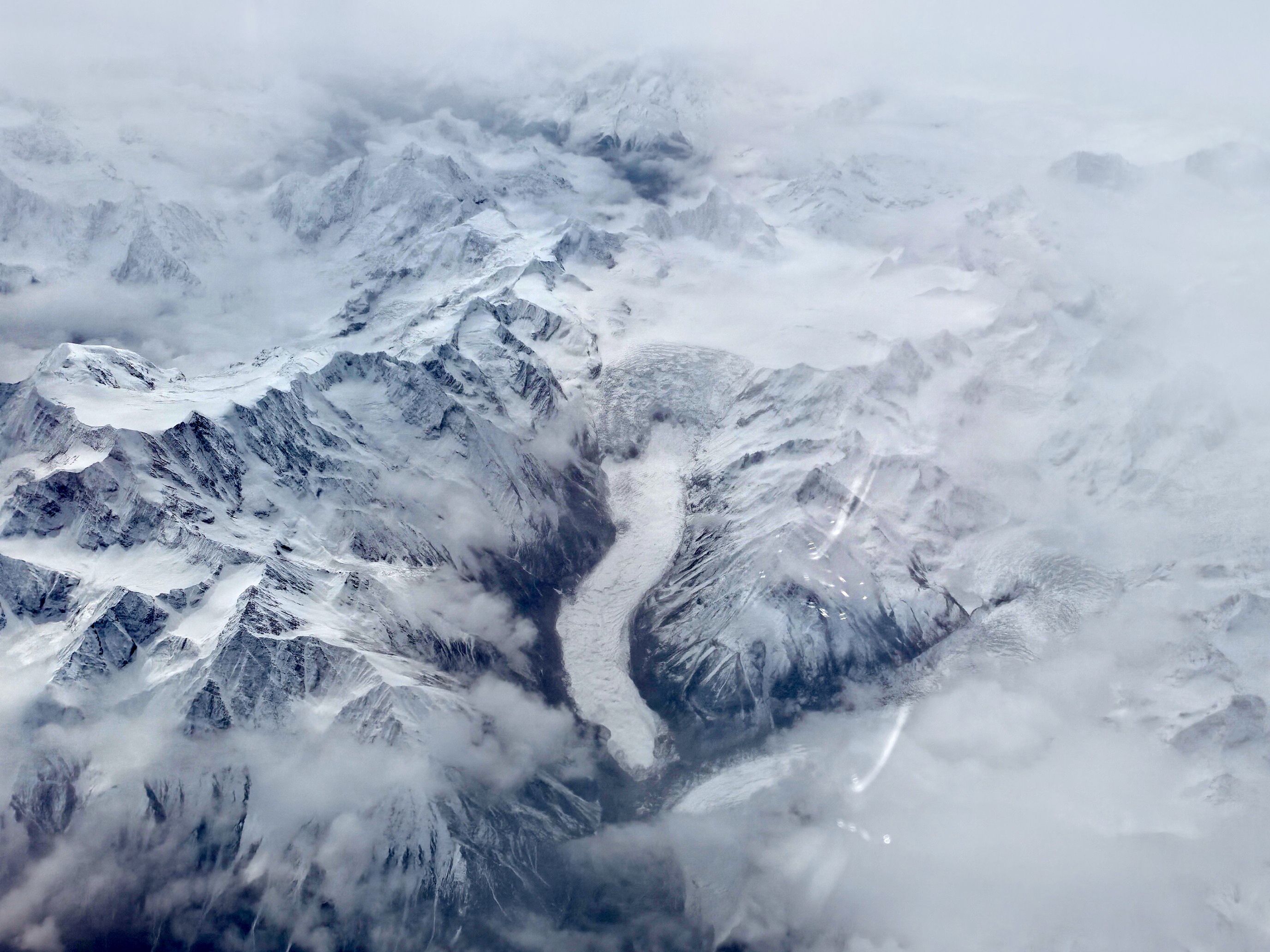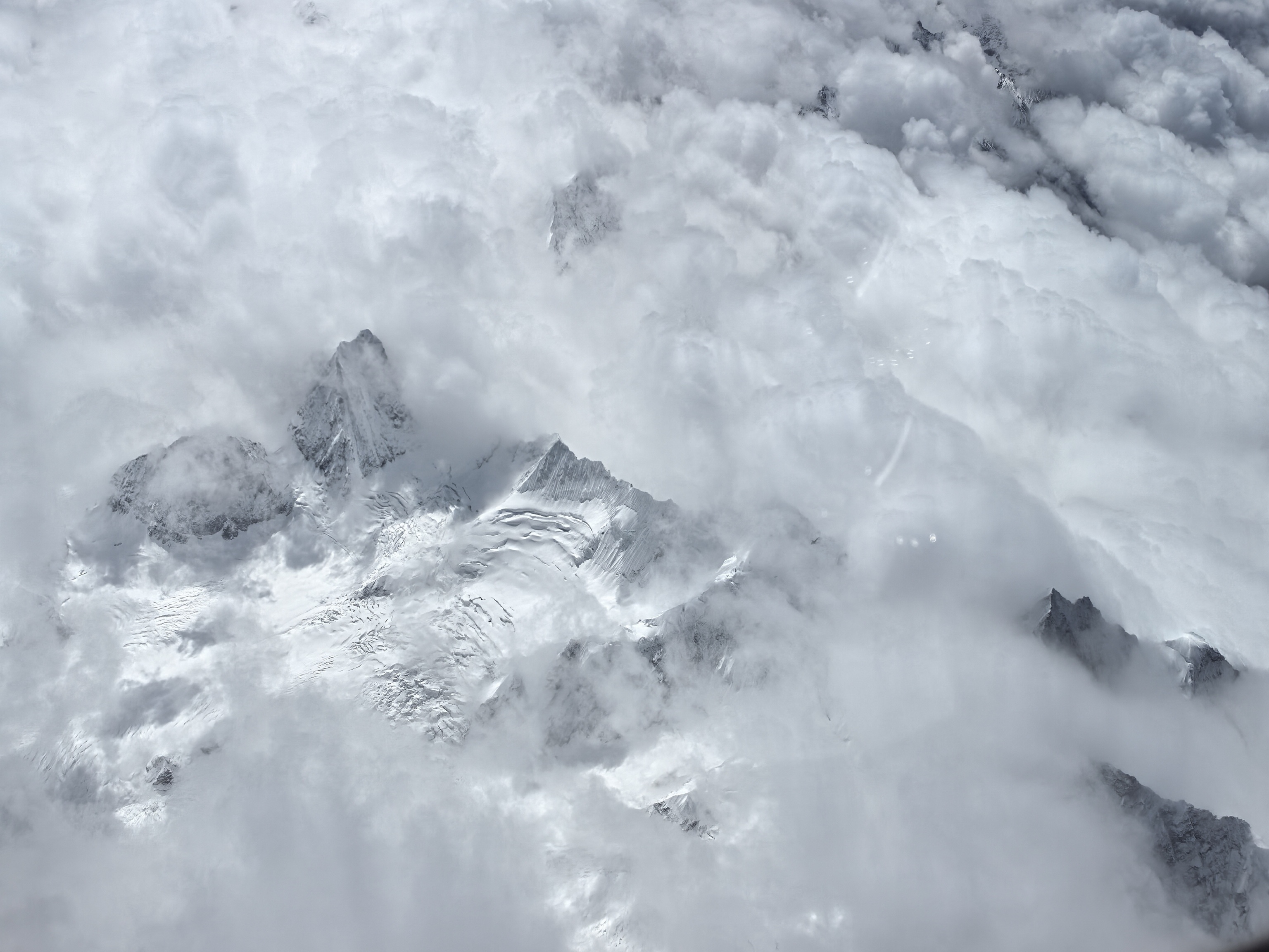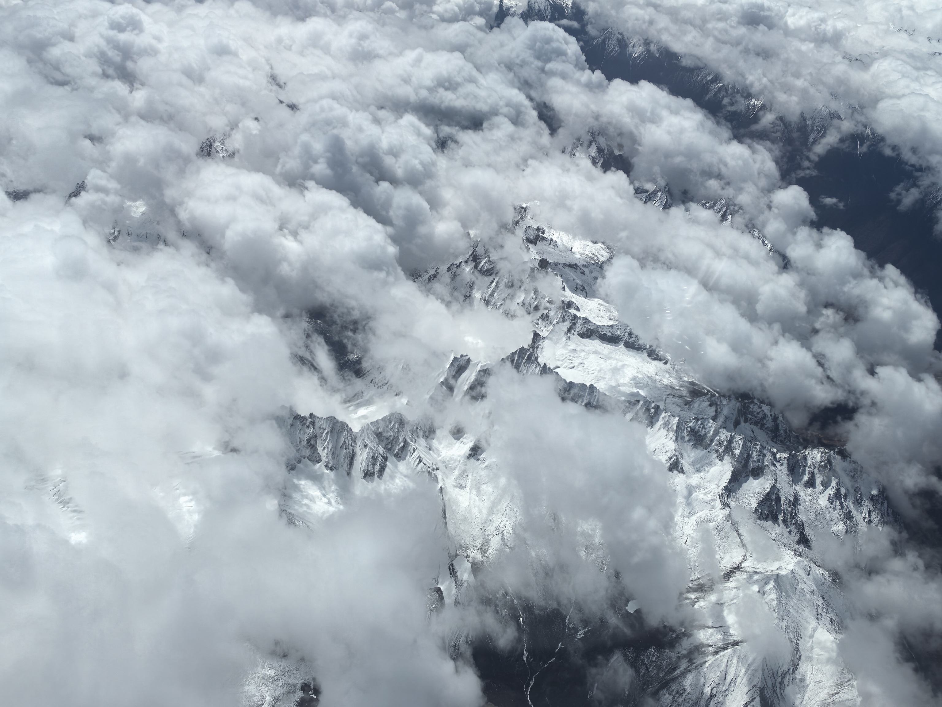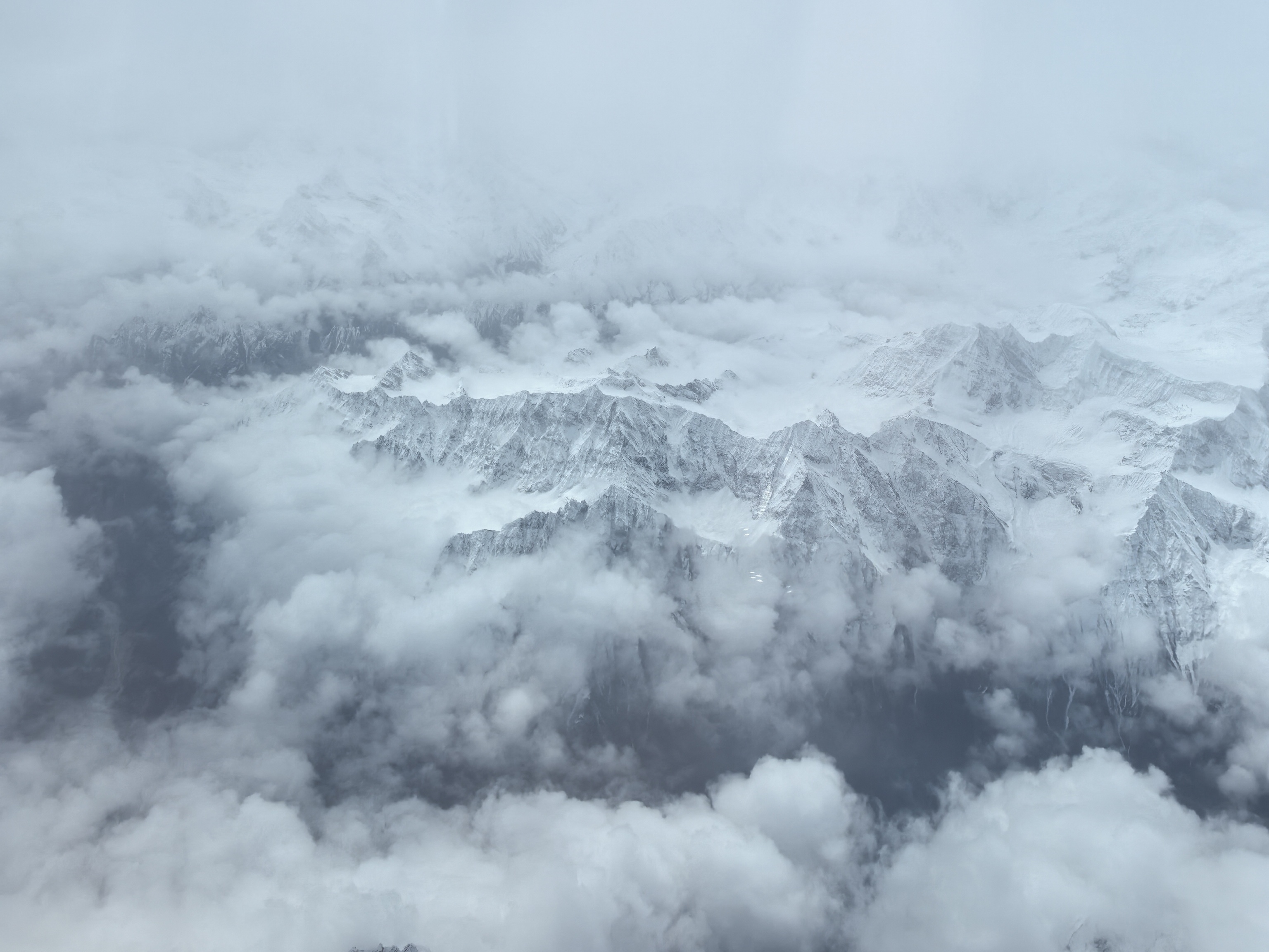 云,在这一段航程里,也变得格外温柔。它们不再是高空里厚厚铺展的云海,而是一丝丝、一缕缕,轻盈地缠绕在山腰之间。有的像轻纱,半遮半掩地罩住雪峰;有的像烟霞,顺着山谷的方向缓缓流动;还有的就停在雪峰旁边,与雪山并肩而立,雪是白的,云也是白的,雪静,云动,一时间竟让人分不清,哪里是雪,哪里是云。飞机平稳地穿行在雪峰与流云之间,机身微微震颤,那震颤不是颠簸,而是一种穿行在壮阔天地间的沉稳,让人既心怀敬畏,又觉得无比安心。