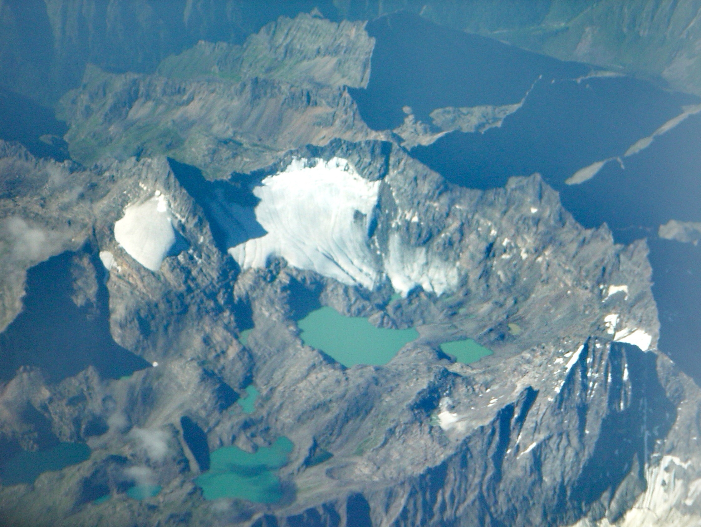 再往前,便是横亘在航线中央的唐古拉山脉。这一段,是整趟航程里最为壮丽、也最为庄严的一段。雪峰一座连着一座,连绵不绝,看不到尽头。它们高低错落,气势磅礴,肩并肩站在一起,构成了青藏高原的脊梁。山顶的积雪终年不化,冰层在阳光下泛着冷冽而神圣的光,巨大的冰川顺着山谷缓缓向下延伸,形成一道道冰舌,晶莹剔透,如同白玉雕琢而成。从这个高度望去,你能清晰看见冰川的纹理,那是岁月留下的痕迹,是寒冷与挤压共同造就的奇观。没有任何人工建筑,没有任何人为痕迹,天地苍茫,唯有雪山耸立,万籁俱寂,只剩下飞机引擎均匀的声响,在空旷的天地间轻轻回荡。