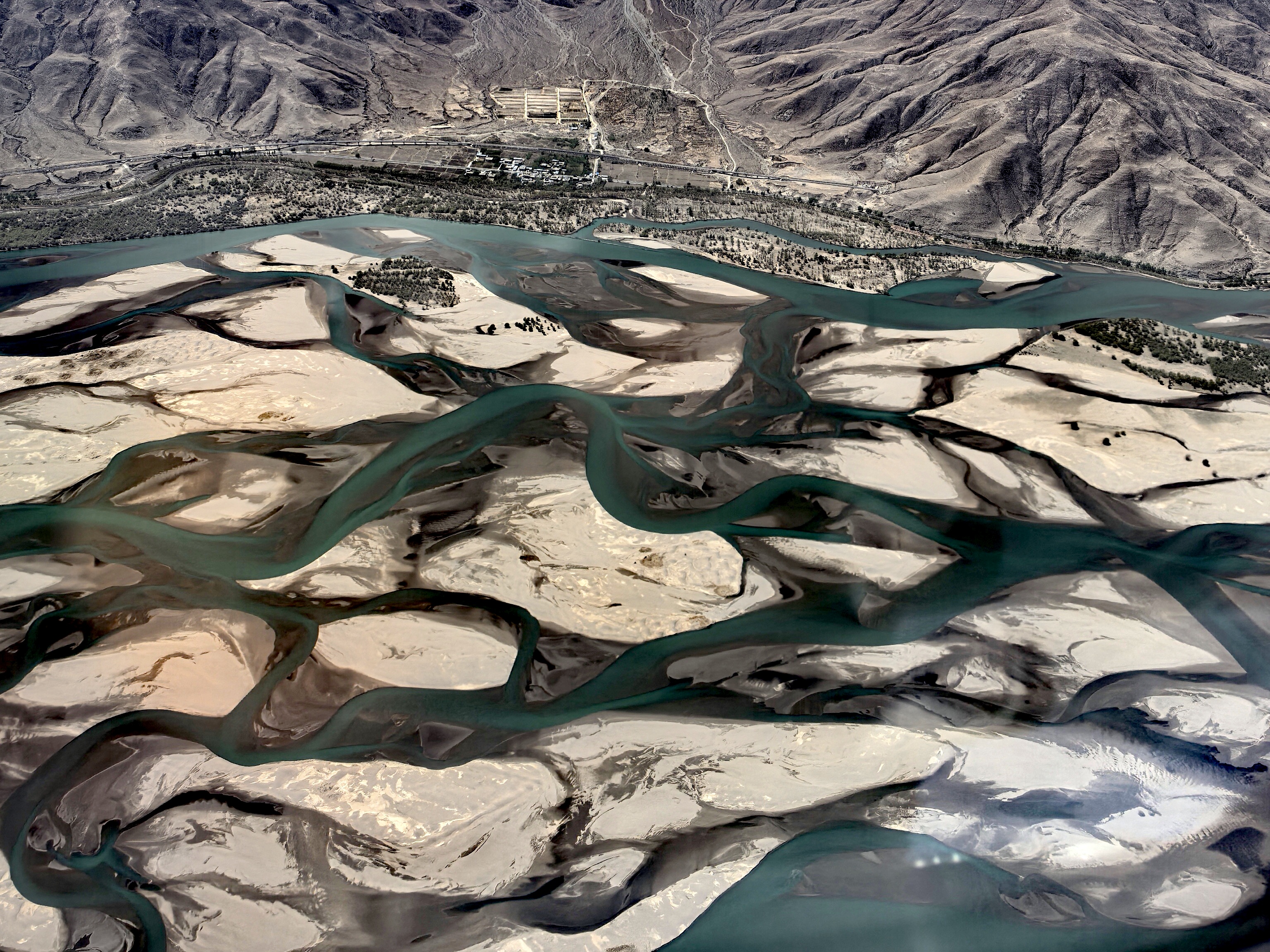 越过拉萨,飞机正飞行在河谷上空,我以为是拉萨河。因为“自古以来”,直到去年年底我到拉萨,飞机还是先沿拉萨河向西飞,到曲水与雅鲁藏布江汇流处再转向东,朝雅江下游方向降落到贡嘎机场。向下看去,郁郁葱葱的河谷地貌,江水潺潺流淌,两岸群山环抱,一座座菱形的沙洲被翡翠般的辫状河流镶嵌在一起,像是一件金缕玉衣。但这宽阔的程度不像拉萨河啊?突然已经望得见航站楼了,在飞机左侧。原来,现在是从雅鲁藏布江下游方向自东朝西降落到新跑道。