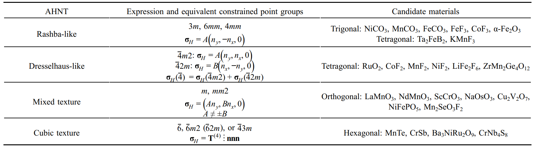 交错磁体,作为一种新型的共线反铁磁体,因其零净磁化和动量依赖的自旋分裂而引发了广泛的兴趣。尽管交错磁体的磁性结构较为简单,但它们在反常霍尔效应(以及磁光效应)与奈尔矢量之间的依赖关系上却展现出有趣而复杂的特性,这与传统铁磁体中霍尔电流与磁化之间的垂直配置形成了鲜明对比。在本项研究中,我们使用了一种“外禀参量”方法,用以揭示奈尔矢量空间中的反常霍尔效应的结构,并将其命名为反常霍尔-奈尔纹理(Anomalous-Hall Néel texture, AHNTs)。经过系统的对称性分析,发现 AHNTs 与动量空间中的自旋纹理具有相似性,并在此基础上总结出了 10 种共 4 类的 AHNTs(详见表 1)。