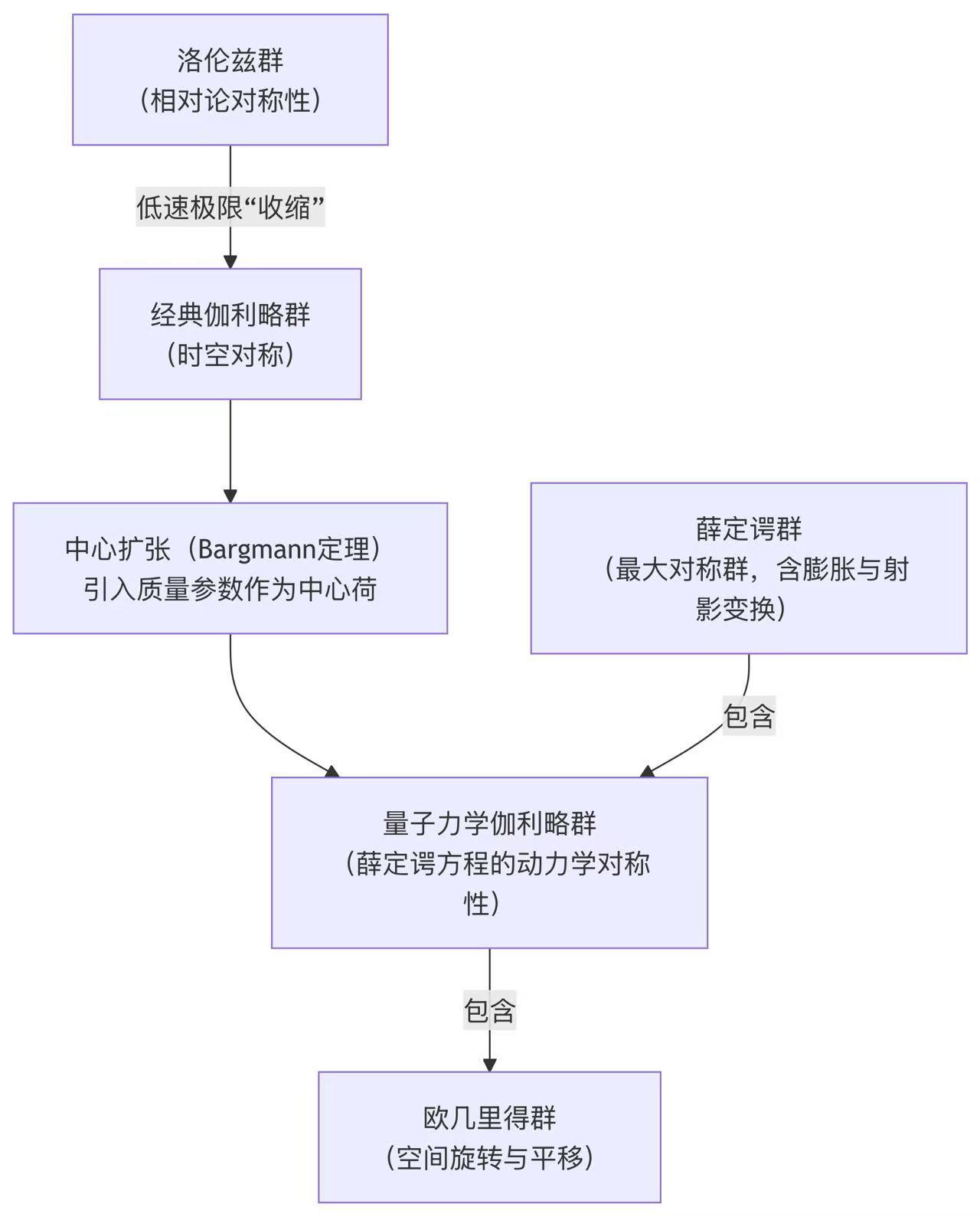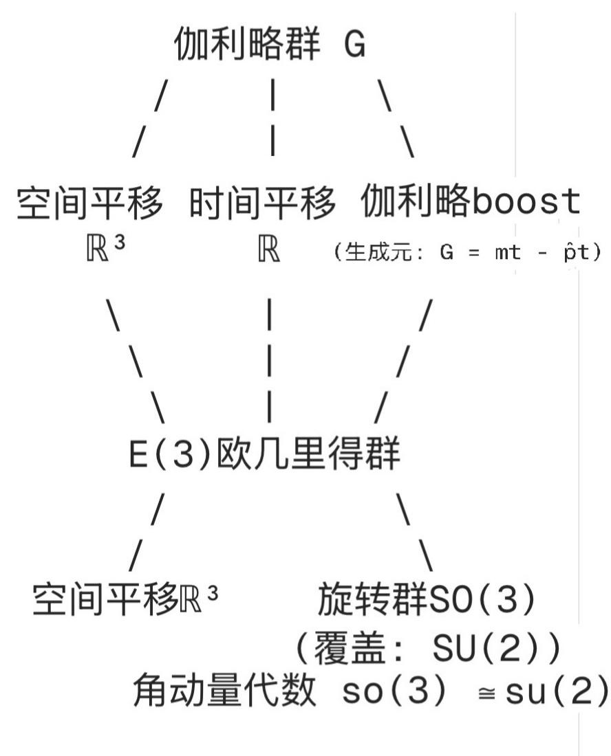综上所述,空间平移群 (ℝ³, +) 和三维旋转群 SO(3) 共同构成了三维欧几里得群 E(3)。伽利略群则是在 E(3) 的基础上,再加入时间平移 (ℝ, +) 和伽利略 boosts(惯性系之间的匀速运动变换)构成的。伽利略群的标准分解G=R3⋊(SO(3)×R3)×T(1),即:空间平移 ⋊(旋转 × boost) × 时间平移。 物理意义:非相对论时空下,物理规律在任意平移、旋转、匀速运动、时间平移下均保持不变,薛定谔方程形式不变。此外,标度不变性对应的膨胀群与伽利略群结合可扩展为薛定谔群,该群是自由粒子薛定谔方程的全对称群。