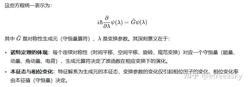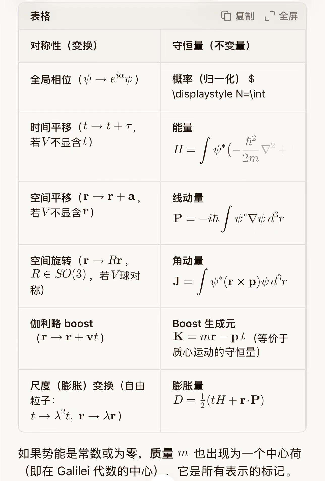 上面这组"广义薛定谔方程",是诺特定理在量子力学的标准实现,将对称性和守恒量深度绑定,某特征不变量的集合(子特征空间)对应于某不变量的变换(子群),解析了量子力学对称性与守恒律的核心结构。
