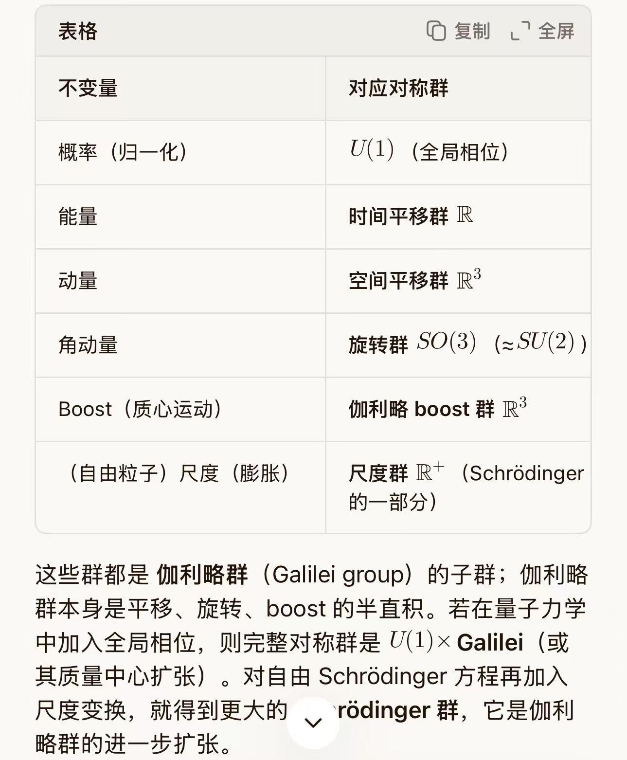 薛定谔方程隐含的不变量主要包括能量、动量和角动量,这些守恒量对应着特定的对称群:能量守恒对应时间平移群(实数加法群 R),动量守恒对应空间平移群(三维欧几里得平移群 R³),角动量守恒对应旋转群(三维特殊正交群 SO(3))。这些群都是伽利略群的子群,在非相对论量子力学中,薛定谔方程在伽利略变换下具有不变性,因此伽利略群整合了这些对称性,包含时间平移、空间平移、旋转和伽利略提升(boost)等变换。