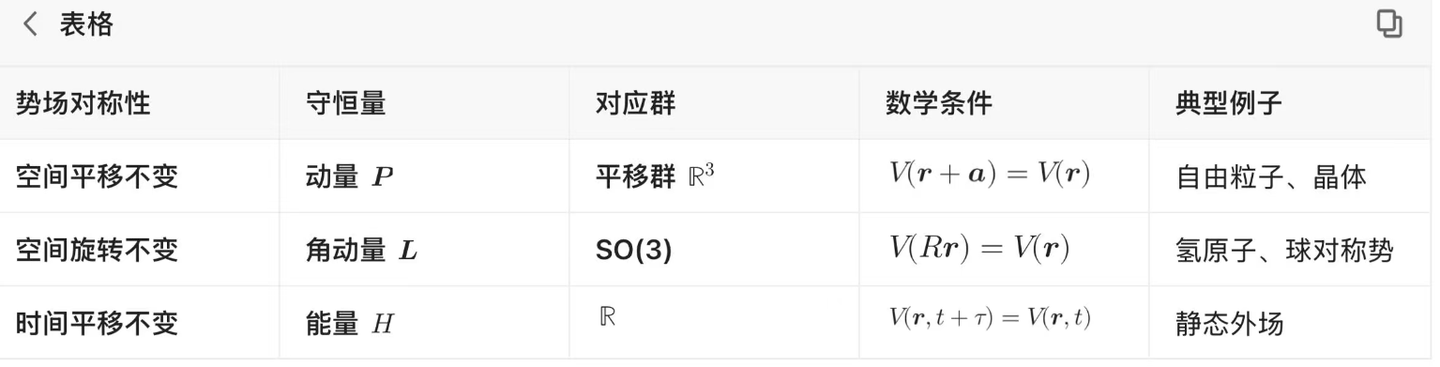 • 从对称性角度,分别对应时间平移对称性(能量)、空间平移对称性(动量)、空间旋转对称性(角动量)、U(1)规范对称性(电荷);