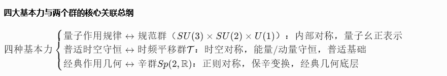 注:标准模型的电弱统一群为SU(2)L×U(1)Y,自发对称破缺后分解为SU(2)L×U(1)EM;引力的群描述尚未量子化,经典层面为广义相对论的微分同胚群(时空流形的对称群),其线性近似为洛伦兹群SO(3,1)。