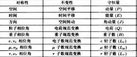 exp(iHτ/ℏ),能量H与时间τ对偶,能量守恒定律源自于能量H对于时间τ的平移对称性,τ变化保持H本征值不变; exp(iPx/ℏ),动量算符P与位置算符X对偶,动量守恒定律源自动量P对于空间位置X的平移对称性,X变化保持P本征值不变; exp(iθJ/ℏ),角动量J与旋转角θ对偶,角动量守恒定律源自角动量J对于旋转角θ的空间旋转对称性,θ变化保持J本征值不变; exp(iαQ/ℏ),电荷算符Q与相位参数α对偶,电荷守恒定律源自电荷Q对于相位α变化对称性,α变化保持Q本征值不变。