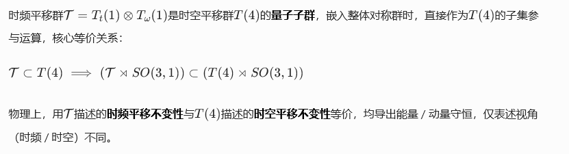 T是时空平移群T(4)的量子时频表示,而T(4)与洛伦兹群SO(3,1)共同构成庞加莱群Po(3,1)=T(4)⋊SO(3,1)(时空的完整对称群)。
