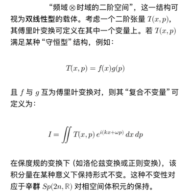 辛不变量 是 时频二阶空间不变量的经典原型。辛空间的核心不变量是辛形式(保辛形式不变是辛变换的本质),而时频二阶张量积空间的所有不变量,都是辛不变量在量子希尔伯特空间的复合与推广: