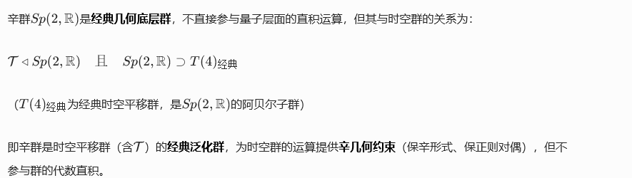辛群定位:不参与量子层面群的直积运算,仅为时空平移群(含T)提供经典几何底层,约束所有粒子 / 力的经典变换满足保辛形式。