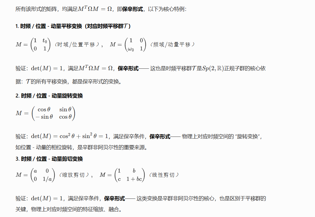 辛群是经典正则空间 / 时频对偶空间的几何对称群,核心约束是保辛形式(非退化、反对称双线性型);