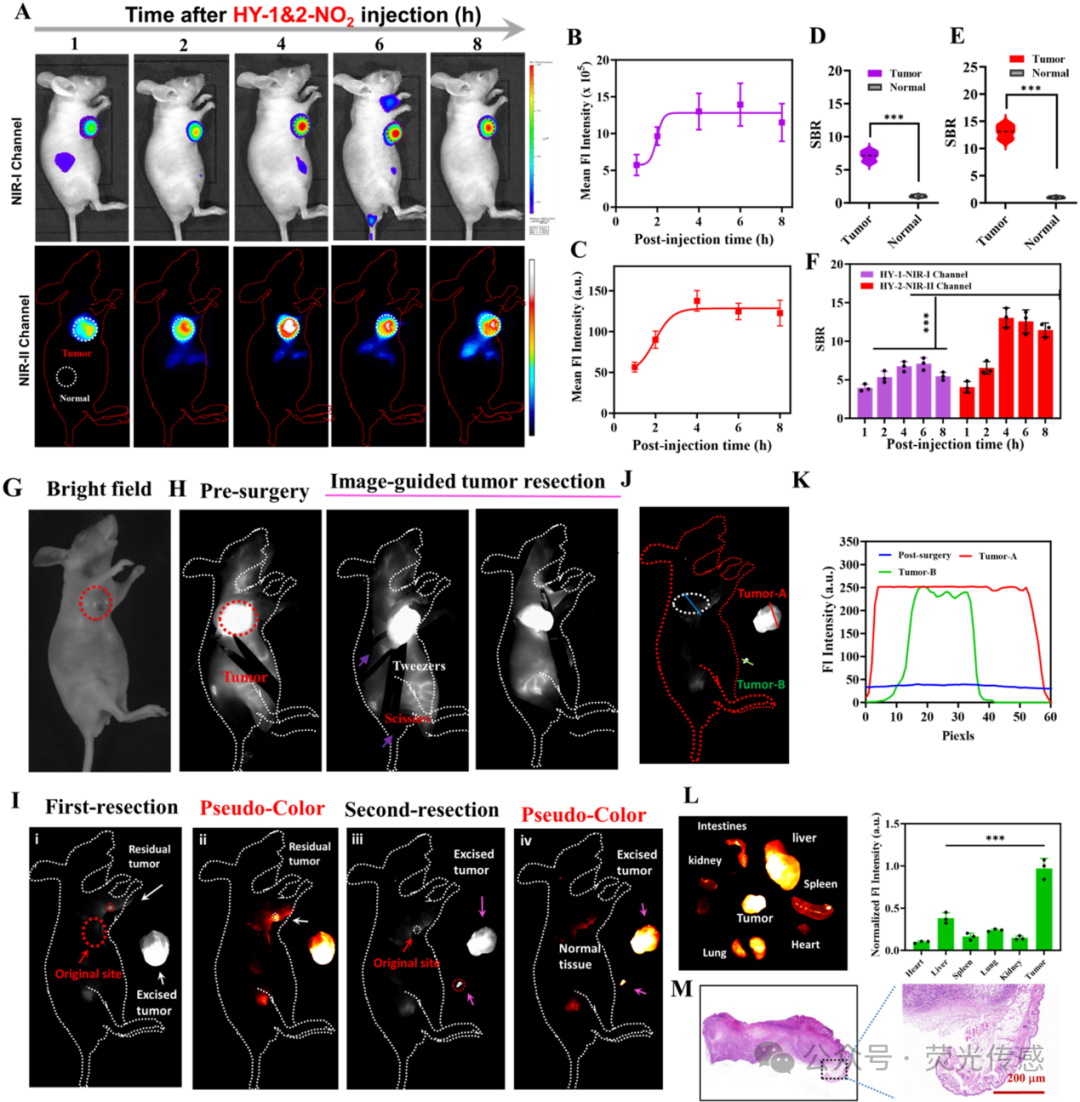 图4. 活体小鼠肿瘤实时成像及影像引导的肿瘤切除手术。(A) 原位注射HY-1-NO2与HY-2-NO2(50 μL, 1 mM)后小鼠随时间变化的荧光成像图。(B, C) HY-1-NO2 (B) 与HY-2-NO2 (C) 在肿瘤部位荧光强度的时序定量曲线。(D, E) 注射探针4小时后基于(B, C)计算的肿瘤/正常组织信号比值。(F) 两种探针随时间变化的动态T/NT比值。数据表示为均值±标准差(n=3);*p < 0.001。(G) 荷瘤小鼠明场图像。(H, I) NIR-II荧光引导的手术切除流程:术前肿瘤定位、初步切除及后续精细化处理。(J) 线扫描分析区域示意图:原发性肿瘤、残余肿瘤及原肿瘤位点。(K) 沿(J)中标示组织区域的荧光强度分布曲线。(L) HY-2-NO2注射8小时后离体肿瘤及主要器官荧光图像与归一化信号强度。(M) 肿瘤切缘苏木精-伊红染色图像。比例尺:200 μm。