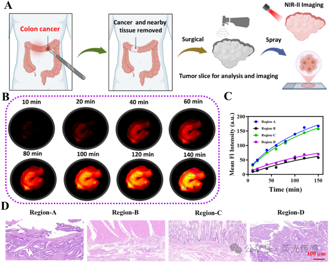 图6. NIR-II影像导航技术在临床癌症样本中的应用。(A) 使用HY-2-NO2探针检测人体组织癌变区域的流程示意图。(B) 临床组织样本原位喷洒HY-2-NO2(50 μL, 1 mM)后的离体NIR-II荧光成像图。(C) 肿瘤区域(A-D)NIR-II荧光强度随时间变化的动态曲线。(D) A-D区域肿瘤组织的H&E染色图像。
