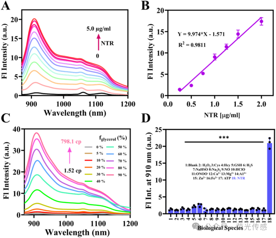 图3. (A) HY-2-NO2(10 μM)在不同浓度NTR(0-5 μg/mL)的PBS-甘油缓冲体系(pH 7.4, 50%甘油)中的近红外二区荧光光谱。(B) 910 nm处荧光强度与NTR浓度(0.25-2.0 μg/mL)的线性关系。(C) HY-2-NO2(10 μM)在含5 μg/mL NTR、不同粘度PBS-甘油混合体系中的荧光光谱。(D) HY-2-NO2对不同干扰物质的荧光光谱响应变化。检测参数:λex = 808 nm,λem = 880-1200 nm。
