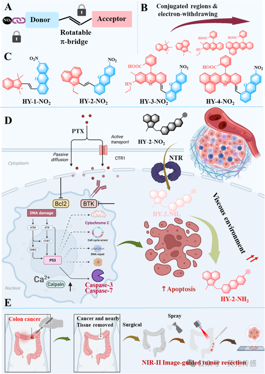 方案1. (A-C) 近红外荧光探针HY-1-4-NO2的工程设计策略与分子结构示意图;(D) 通过NTR/粘度双响应成像实时评估与监测紫杉醇抗癌疗效;(E) NIR-II影像导航技术在临床癌症样本中的应用。