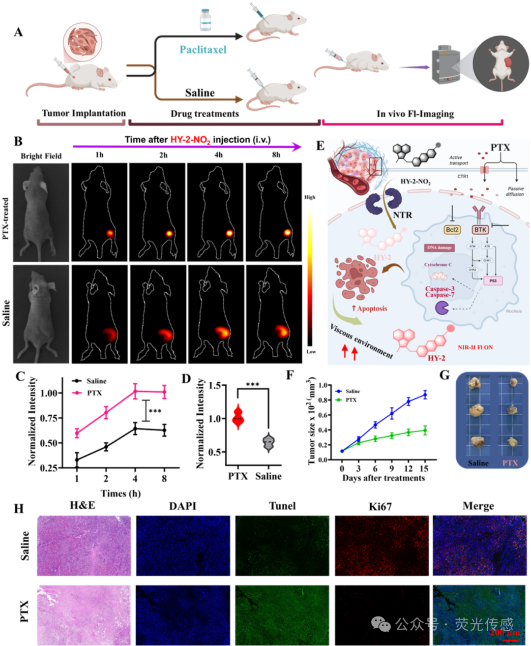 图5. (A) 荷瘤模型构建、药物治疗及活体成像的时间轴示意图。(B) 原位注射HY-2-NO2(50 μL, 1 mM)后,经PTX处理(上图)与生理盐水处理(下图)的荷瘤小鼠实时成像。近红外荧光成像条件:808 nm激发光,900 nm长通滤光片采集。(C, D) 肿瘤部位归一化荧光强度随探针注射后时间点的变化关系。(E) 通过NTR/粘度激活型NIR-II信号即时评估PTX疗效的策略示意图。(F) 不同治疗组相对肿瘤体积变化。(G) 15天后各组小鼠肿瘤实物图。(H) 第G组肿瘤组织的H&E染色及Ki67、Tunel免疫荧光染色结果。比例尺:200 μm。