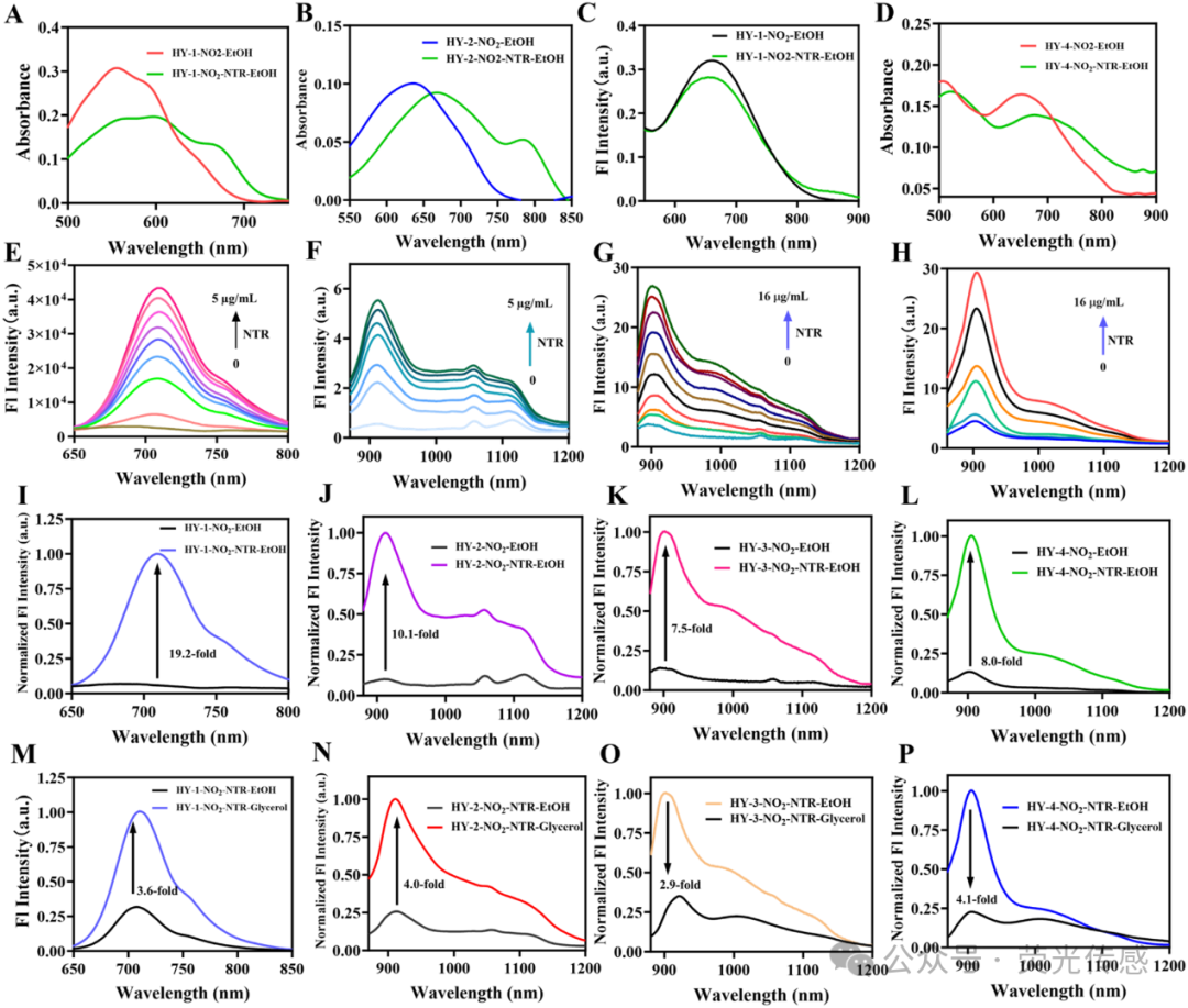 图1. HY-1−4-NO2探针经NTR激活后在PBS缓冲液中的光谱表征。(A-D)HY-1-NO2(A)、HY-2-NO2(B)、HY-3-NO2(C)和HY-4-NO2(D)(10 μM)经NTR处理后的吸收光谱。(E-H)HY-1-NO2至HY-4-NO2(10 μM)响应不同浓度NTR的荧光发射光谱。(I-L)HY-1-NO2(I)、HY-2-NO2(J)、HY-3-NO2(K)和HY-4-NO2(L)在NTR添加前后的荧光增强比率。(M-P)HY-1-NO2(M)、HY-2-NO2(N)、HY-3-NO2(O)和HY-4-NO2(P)在PBS/乙醇与PBS/甘油缓冲体系中经NTR处理后的归一化荧光光谱。所有近红外一区测量参数:λex = 630 nm,λem = 650−800 nm;近红外二区测量参数:λex = 630 nm,λem = 880−1200 nm。