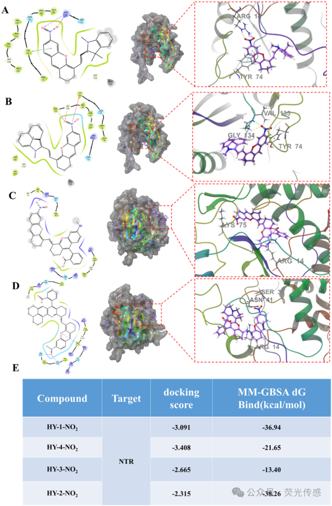 图2. HY-1-NO2 (A)、HY-2-NO2 (B)、HY-3-NO2 (C) 和 HY-4-NO2 (D) 与NTR蛋白对接的二维及三维图像。(E) HY-1−4-NO2与NTR蛋白的SP对接及MM-GBSA分析结果。