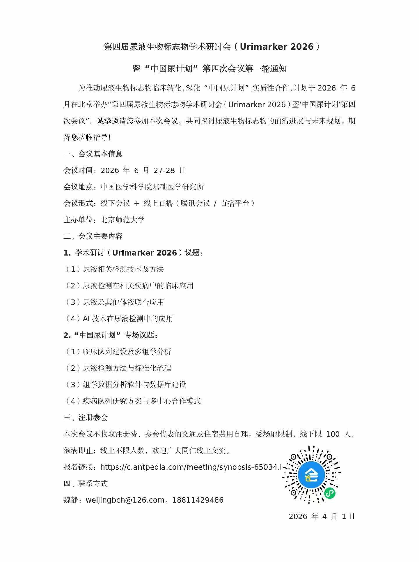 为推动尿液生物标志物临床转化,深化 “中国尿计划” 实质性合作,计划于2026 年 6月在北京举办“第四届尿液生物标志物学术研讨会(Urimarker 2026)暨‘中国尿计划’第四次会议”。诚挚邀请您参加本次会议,共同探讨尿液生物标志物的前沿进展与未来规划。期待您莅临指导!