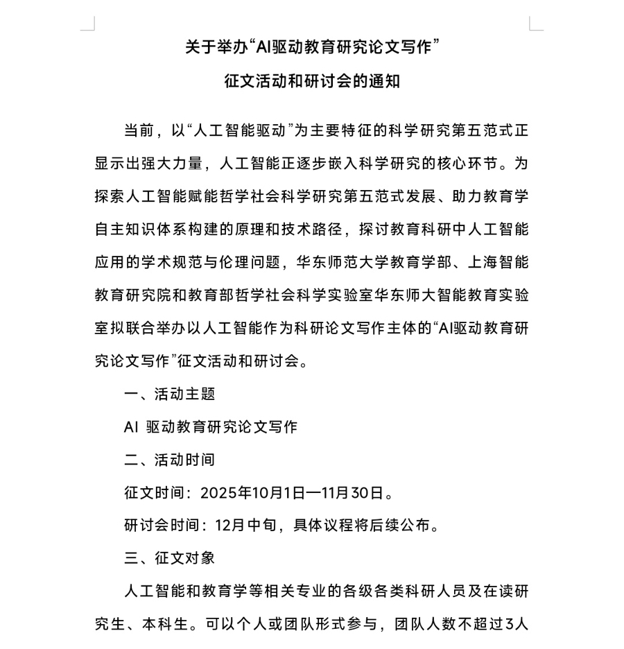 昨天的《中国科学报》文章《人工智能当第一作者,谁是知识的创造者?》引人深思。数年前,我曾经在科幻微型小说《蒙太奇》里虚构过一个到处“骗取”学者研究灵感,不断变更署名的“机器人作者”。那时候,我对于机器人署名论文是否定的。现在看来,我的思想严重滞后了。机器人、AI 不仅可以大大方方地署名,还可以成为第一作者。"AI驱动教育研究论文写作"征文活动和研讨会通知片段如下。