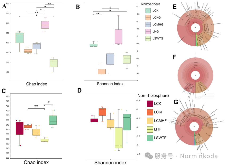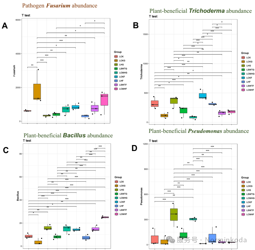 微生物群落重塑:单独施用生物炭会降低真菌多样性,而生物炭与草木灰组合(LHG处理) 则显著提高了根际土壤中真菌和细菌的α多样性。该处理 specifically 富集了有益微生物,如丛枝菌根真菌(AMF)Rhizophagus、生防菌Trichoderma(木霉)、Bacillus(芽孢杆菌)和Pseudomonas(假单胞菌),同时显著抑制了核心病原菌Fusarium(镰刀菌)** 的丰度。