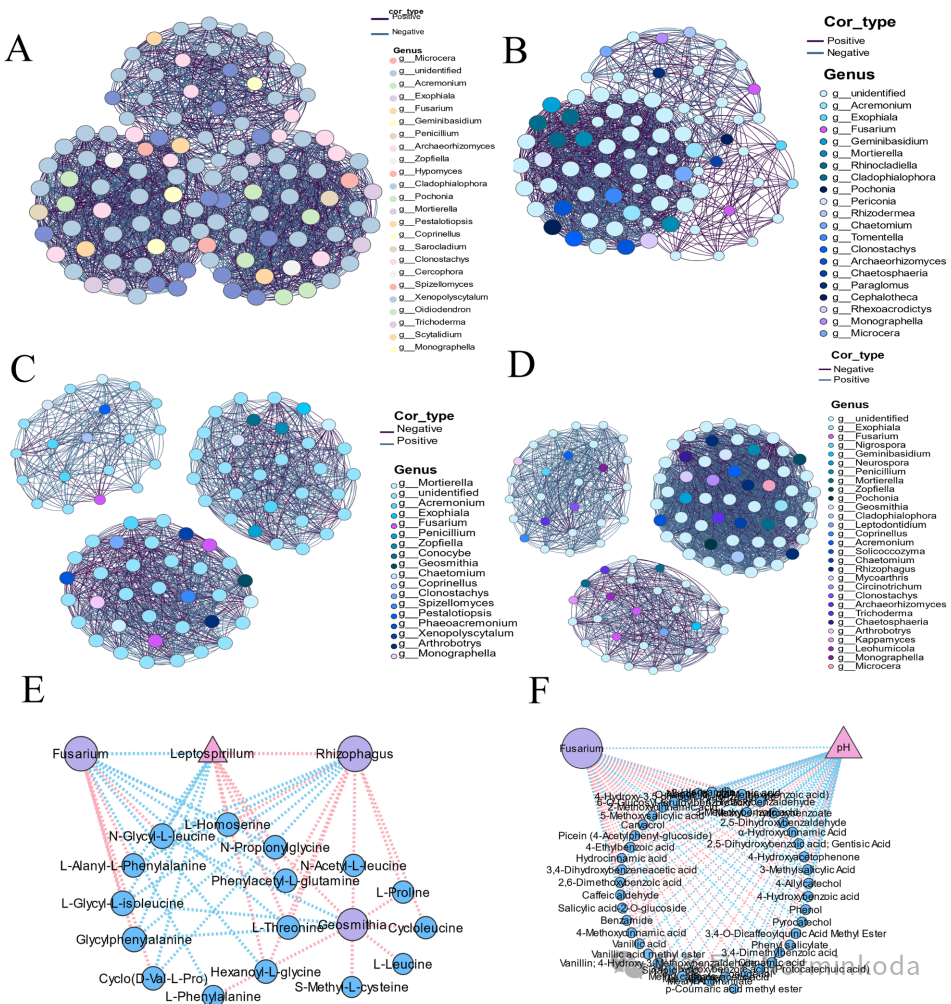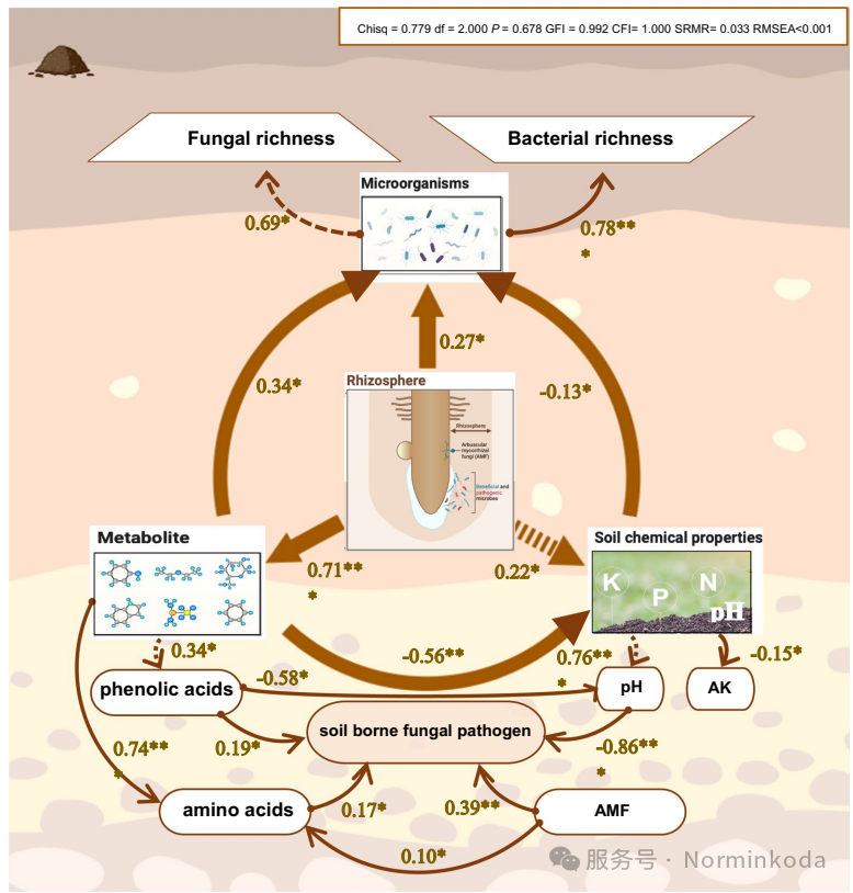 4.网络互作机制:通过共现网络分析和结构方程模型(SEM)构建了“土壤环境-微生物-代谢物”互作框架。证实AMF Rhizophagus作为核心菌群,通过营养竞争(争夺氨基酸)和占据生态位直接抑制病原菌;而土壤pH的升高和酚酸的减少间接削弱了病原菌的生存环境。