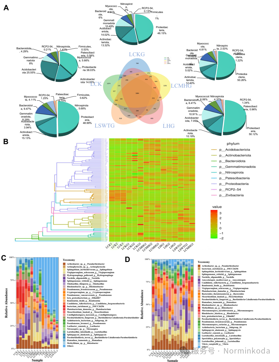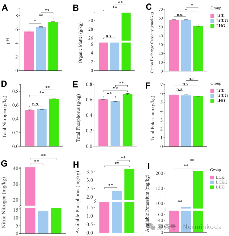 3.土壤环境改善:LHG处理有效中和了土壤酸度(显著提高pH),并大幅提升了土壤有机质(OM)、全氮(TN)、全磷(TP)、速效磷(AP)和速效钾(AK)的含量,为植物和微生物创造了更适宜的生存环境。
