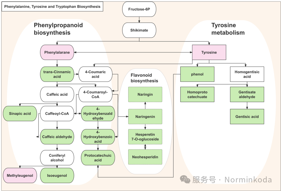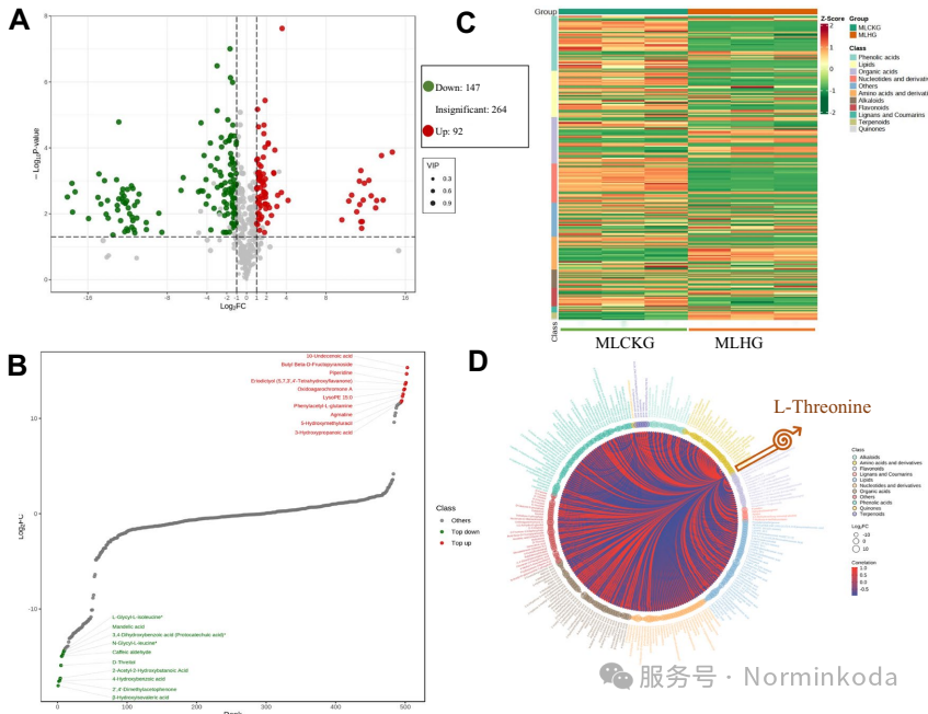 2.代谢通路调控:代谢组学分析揭示,LHG处理上调了苯丙氨酸-酪氨酸-色氨酸的生物合成途径。这一关键转变导致根际土壤中自毒酚酸类物质(如4-羟基苯甲酸、咖啡醛)的含量显著下降,而氨基酸(如L-苯丙氨酸、L-酪氨酸、L-苏氨酸)的含量则积累增加。这减少了对植物根部的自毒作用,并为有益微生物提供了营养。
