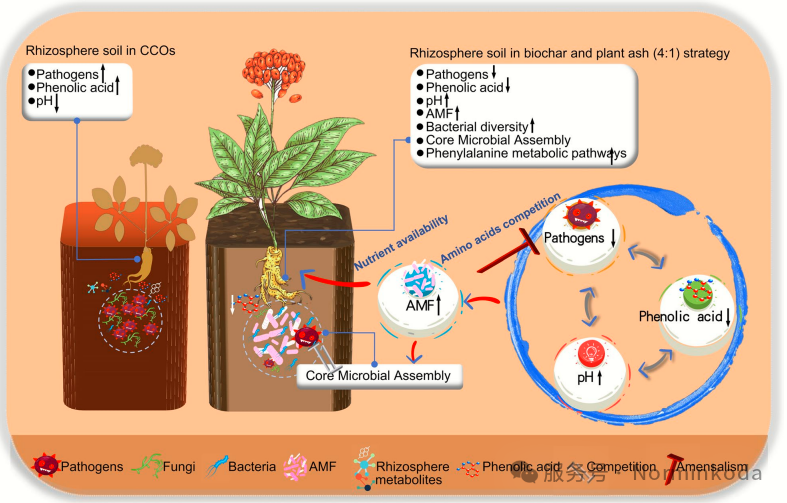 本研究阐明了一种协同修复根际生态以克服连作障碍的有效策略: