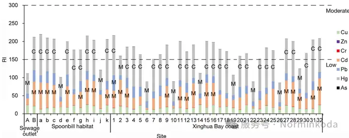 本研究针对中国东南沿海重要的黑脸琵鹭越冬地——兴化湾,在2023年1月越冬期采集了45个水样(包括工厂排污口、琵鹭栖息地及海岸线),分析了7种重金属(Cu, Zn, Cr, Cd, Pb, Hg, As)和有机污染物(COD, BOD, DIN等)的污染程度。采用内梅罗指数(NPI)、重金属污染指数(HPI)和污染程度(CD)评估重金属污染水平,利用潜在生态风险指数(RI)评估生态风险,并通过正矩阵因子分解(PMF)模型解析污染源。结果表明,兴化湾存在中度至重度重金属污染和中度生态风险,其中Hg和Cd是主要污染因子,有机污染水平严重。海湾及周边的贝类养殖施肥和水产养殖是氮磷超标的主要原因,周边工厂是重金属和有机污染的主要来源。研究提出了增加黑脸琵鹭种群和增强其栖息地的保护措施。