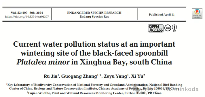 Jia R, Zhang G, Yang Z, Yu X (2024) Current water pollution status at an important wintering site of the black-faced spoonbill Platalea minor in Xinghua Bay, south China. Endang Species Res 53:499-508 https://doi.org/10.3354/esr01307