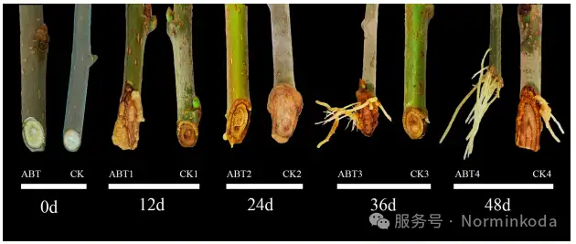 表型观察:ABT1处理组的插穗在48天时,其不定根在长度、数量和质量上均显著优于CK组。