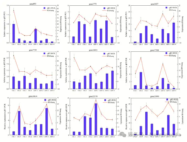 随机选择9个DEGs和4个核心Hub Gene进行qRT-PCR验证,其结果与转录组测序结果高度一致,证明了测序数据的可靠性和准确性。