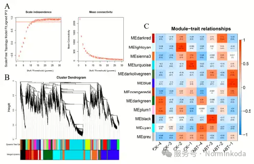其中黑色模块(Black Module) 和蓝色模块(Blue Module) 与ABT1处理组的生根性状相关性最高(相关系数分别达0.98和0.96)。
