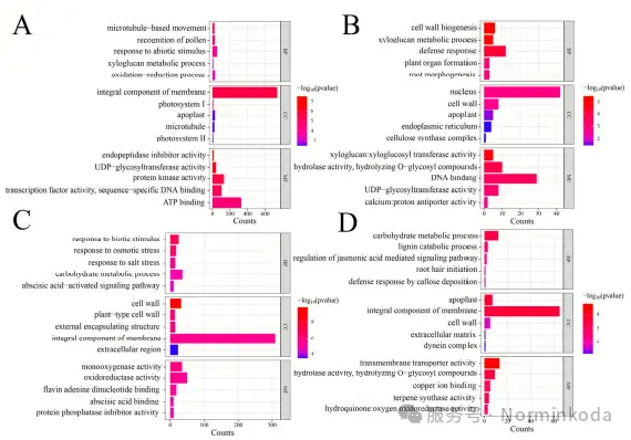 GO富集:DEGs显著富集在微管运动、细胞壁生物合成、对生物/非生物胁迫响应、氧化还原酶活性等生物学过程、细胞组分和分子功能上。