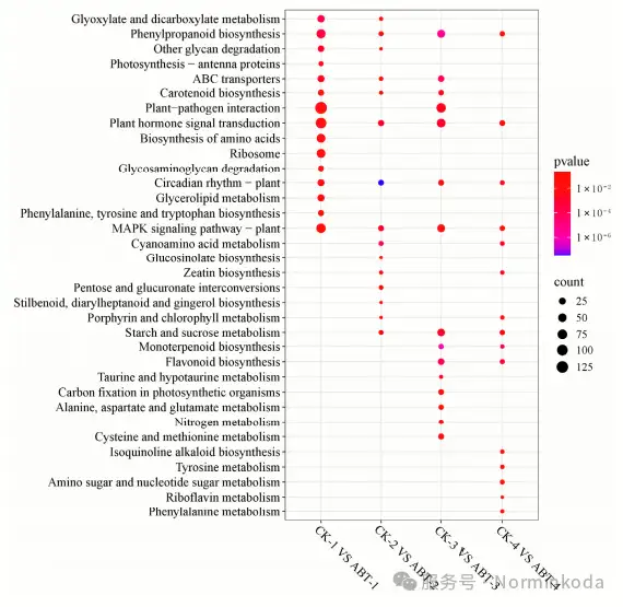 KEGG富集:植物激素信号转导 通路在四个阶段均被显著富集,是最核心的通路。其他重要通路包括 MAPK信号通路、植物-病原互作、苯丙烷生物合成 等。