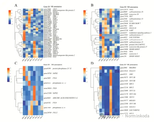 脱落酸(Abscisic Acid):如 PYL4, phosphatase 2C等基因在后期(36, 48天)表达变化显著,可能与根系成熟和应激响应有关。