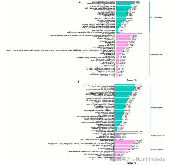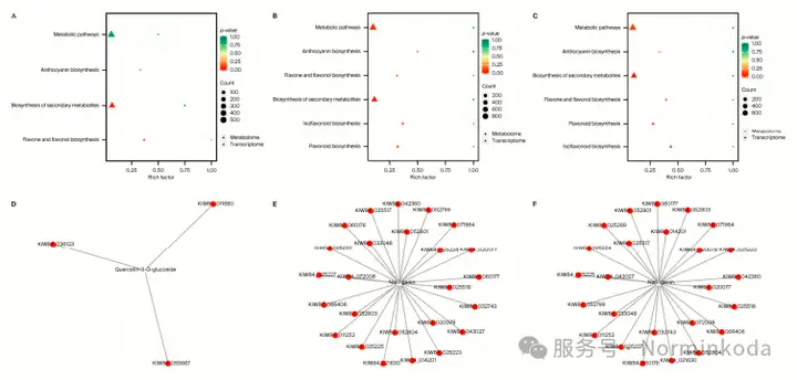 KEGG富集分析:DEGs和差异代谢物(DAMs)共同显著富集在“花青素生物合成”、“黄酮类生物合成”和“次级代谢物生物合成”等通路,证实了这些通路在颜色形成中的核心作用。