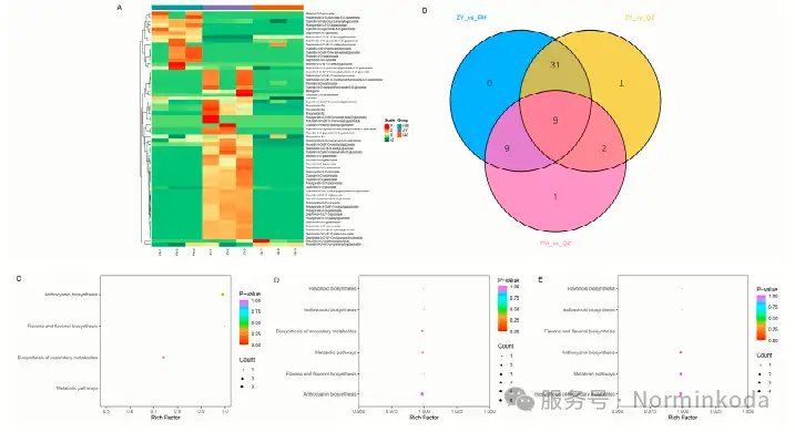 关键基因表达:花青素合成通路中的PAL, 4CL, CHS, F3H, UFGT等结构基因在ZY中的表达量显著高于FM和QZ,这与ZY的高花青素含量表型完全一致。