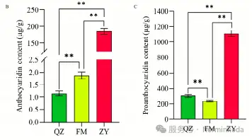 花青素含量:ZY豆荚的总花青素和原花青素含量极显著高于FM和QZ,是其颜色呈紫色的直接原因。